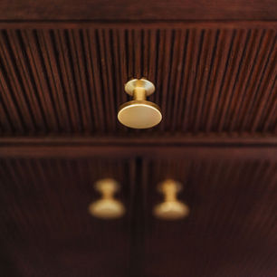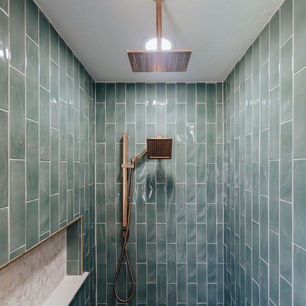 This beautifully remodeled bathroom features a harmonious blend of modern elegance and timeless design. The centerpiece is a rich, dark wood vanity with sleek champagne bronze hardware, complemented by a white marble countertop and dual champagne bronze faucets. Above, arched gold-framed mirrors reflect the serene teal subway tile that adorns the walls, adding a touch of sophistication. The space is illuminated by a stylish gold light fixture, enhancing the warm ambiance. The adjacent shower boasts matching Ocean Front tiles, a rainfall shower-head, and a luxurious dark tile floor with a gold drain, creating a cohesive and inviting retreat.