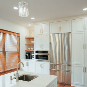 This remodeled kitchen showcases a perfect fusion of modern functionality and classic style. The spacious layout features sleek white cabinetry with gold handles, paired with a pristine white quartz countertop and a large island. A stainless steel refrigerator and a commercial grade oven anchor the space, while a coffee bar and built in microwave. Warm flooring and a tiled backsplash with open shelving bring texture and charm, complemented by elegant pendant lights that illuminate the area, creating an inviting and efficient culinary haven.